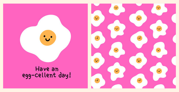 Cute greeting card and seamless pattern with kawaii fried eggs on a bright pink background. Vector hand-drawn flat illustration. Perfect for print, decorations, wrapping paper, wallpaper. Funny design