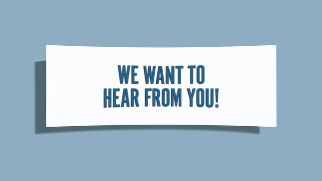 we want to hear from you. A card isolated on blue background.