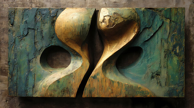 documentary title card | sculptural empathy | maternal abstraction | oxidized green and gold | axial tension | landform symbolism | pierced torso forms | void insertion | void and mass tension |