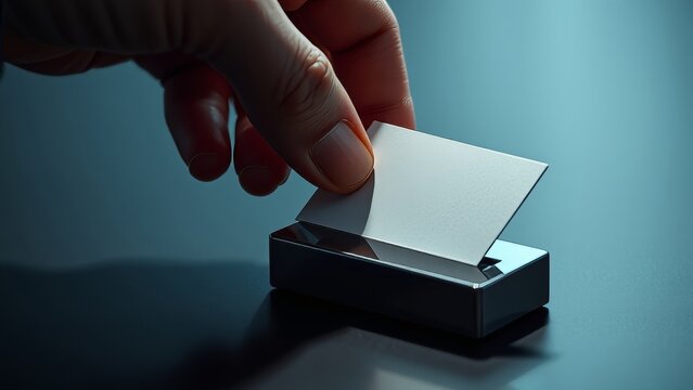 Hand slides card into holder. Hyper-realistic, cool light, smooth texture, cold metal, fine lines, subtle shadows.