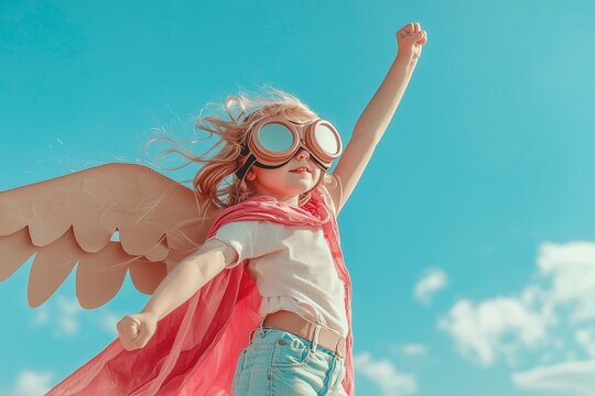 A child with cardboard wings and pilot goggles is flying in the sky, their arm raised up to soar high. The background features clear blue skies without clouds, Happy child playing outdoors