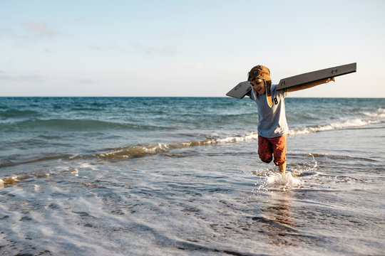 Boy with aviator's cap and cardboard wings running at beach