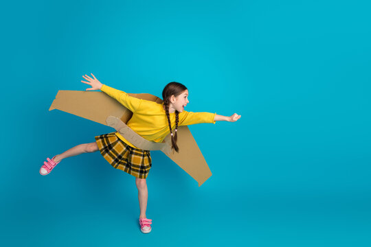 Young cute girl with cardboard airplane wings poses playfully on a blue background, showcasing creativity
