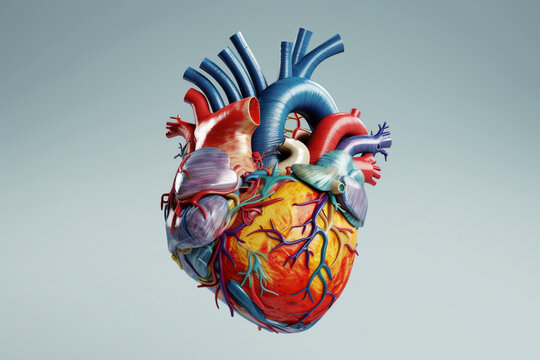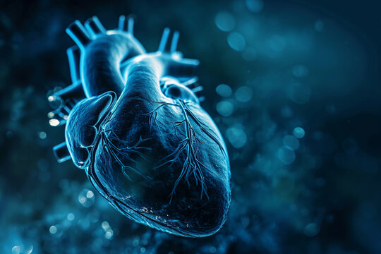 A scientific illustration of a dissected human heart, displaying its internal structures, such as the atria, ventricles, and coronary arteries. Generative AI technology.