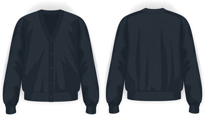 Knit cardigan black v neck with button front and back view, vector mockup illustration