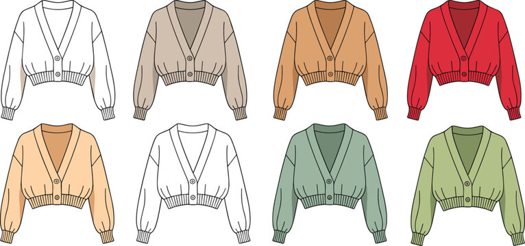 Women cropped cardigan with ribbed hem, button front design, vector flat sketch, fashion cad drawing illustration set