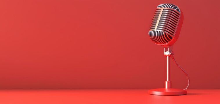Single microphone with coiled cable on red background, minimalist design, vibrant stage or recording concept
