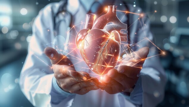 Doctor holding a holographic human heart in a hospital corridor, symbolizing medical innovation and cardiology