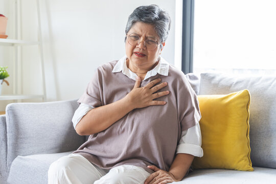Chest pain, attack chest, emergency heartbeat asian senior woman holding hand on chest, suffering symptom from pain, heart disease problem of aged anxiety cardiac. Health care of cardiology concept.