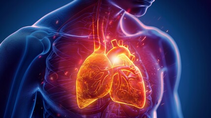 A 3D rendering of the human heart and lungs, showing the circulatory and respiratory systems.