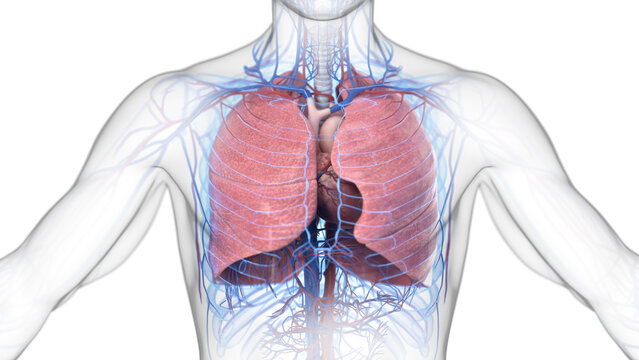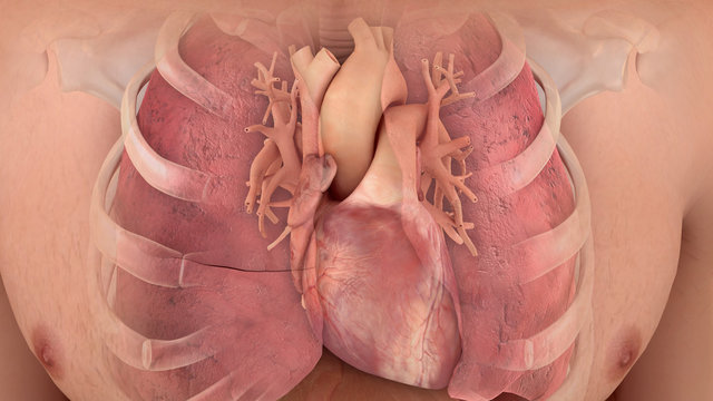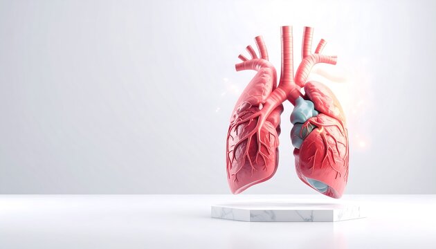 Anatomical model of the human heart and lungs, a 3D illustration of the cardiopulmonary system for medical and scientific concepts.
