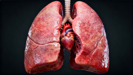 Detailed Human Anatomy: Heart Nestled Between Lungs. detailed close-up illustrating the human cardiopulmonary system. The image clearly displays the two lungs, characterized by a moist, fleshy