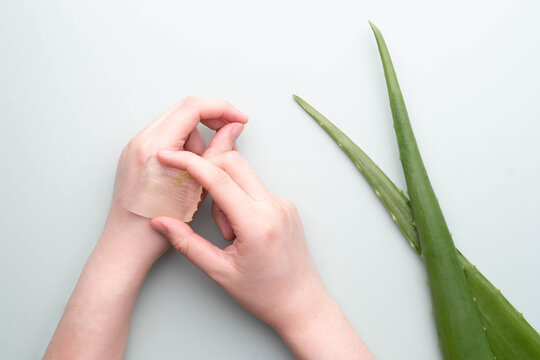 Woman applying fresh aloe vera gel piece to her hands for skin burn healing and pain relief. Medicinal plant used to treat various health conditions.