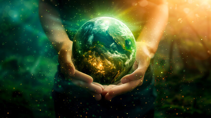 Hands holding a green earth globe symbolizing sustainability and care for the planet.