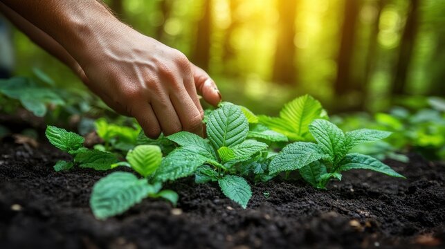 Close-up of farmer’s hands planting young seedlings in rich soil, symbolizing growth, sustainability, and care for the environment