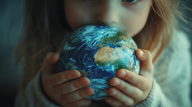 Young girl embracing Earth toy, symbolizing care for environment. Ideal for themes of ecology, sustainable living and education.