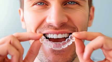 Young Caucasian man inserting a dental aligner. Close-up view. A seamless fit for a flawless smile.