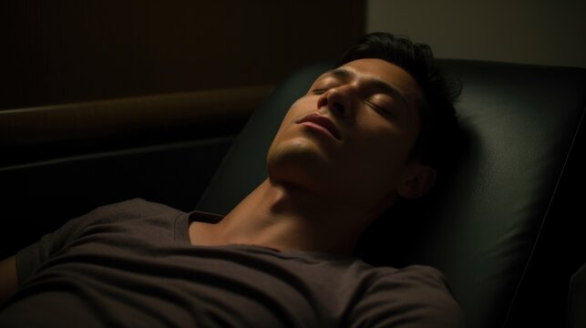 youthful Latino man laying down on therapy couch, eyes closed, deep within session of Prolonged Exposure. the present but quiet, allowing him to narrate distressing memory repeatedly to help