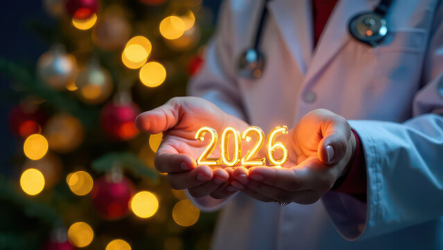 Merry Christmas from doctor, best wishes concept, hands with "2026" on blurred light and tree, gift card banner web template with copy space