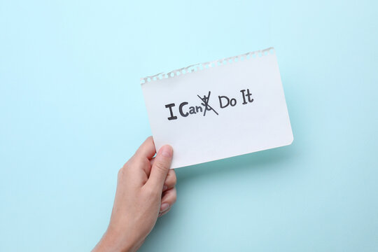 Motivation concept. Woman holding paper with changed phrase from I Can't Do It into I Can Do It by crossing over letter T on light blue background, top view