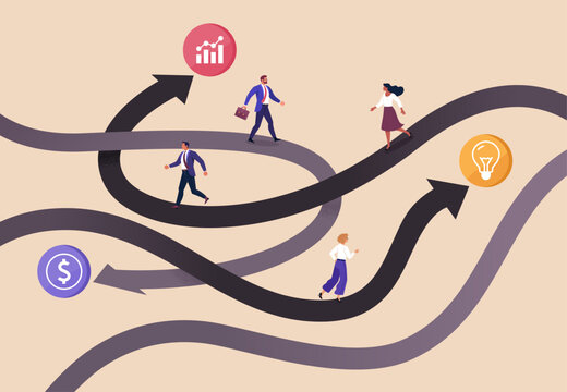 Career Path Concept. Vector illustration of business people walking on different winding roads with arrows leading to icons of growth, money, and ideas, symbolizing career choices and opportunities.