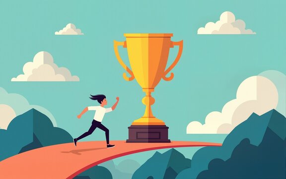 Roadmap to future success, career journey or business plan to reach target, achievement or step to develop and ambition achieve goal, businessman running on business roadmap to reach success trophy.