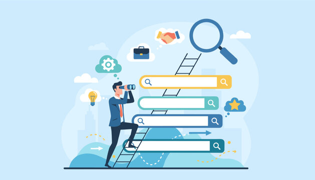 Determined professionals ascend in skills development. Amidst upward arrows and gears, they signify growth, continuous learning, and reaching for higher goals in their career journey. Flat vector.
