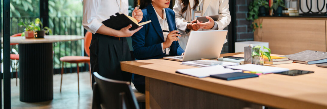 Managers expressing gratitude and appreciation to employee using laptop in the office