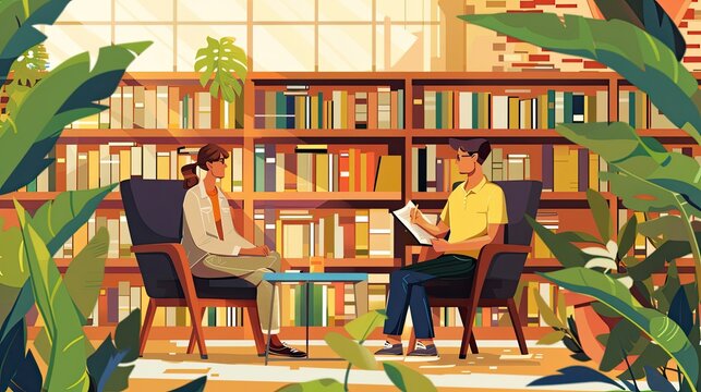 A cozy mentorship meeting at a library with a mentor guiding a student through academic and career decisions