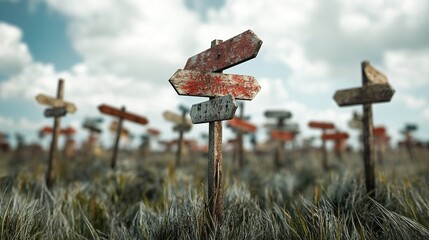 Career Pathfinder, Individual contemplating various pathways in a vibrant field of directional signs, symbolizing limitless professional opportunities.