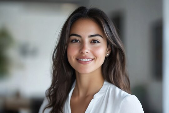 Head shot portrait, beautiful smiling Latina woman posing indoor. Close up profile picture of professional businesswoman, teacher or financial advisor looking at camera with smile, exude competence