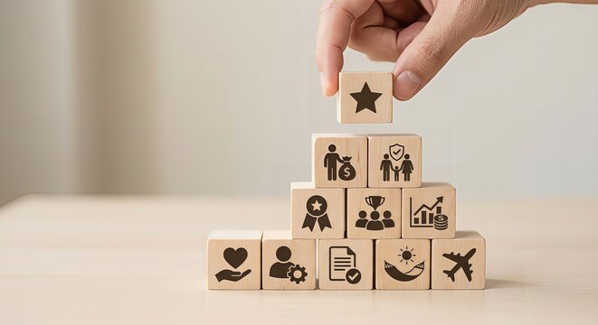 Businessman hand placing wooden block with star icon on top of pyramid, lower blocks with money, insurance, trophy, vacation and career growth icons, symbolic of corporate performance incentives and e