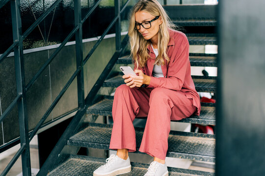 Young casual woman using smartphone while sitting on the iron steps of a modern office building.