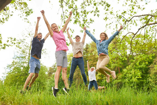Fröhliche junge Leute machen Luftsprünge auf Wiese