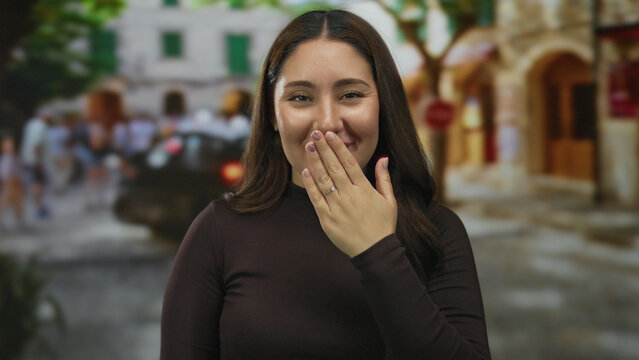 Woman covers mouth with hand while smiling at camera on a busy city street lined with historic buildings; playfulness and warmth.