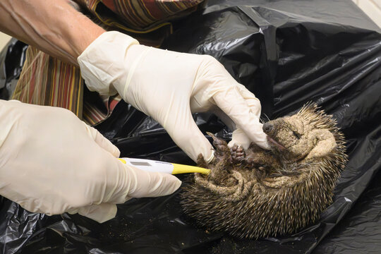 Person in gloves examines a Southern white-breasted Hedgehog with a thermometer on a black surface. Israel