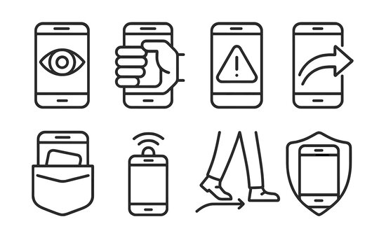 Mobile Safety Icons. Mobile Awareness linear set: focus eye, grip band, alert bubble, safe path arrow, pocket guard, calm beacon, careful step, protective arc.