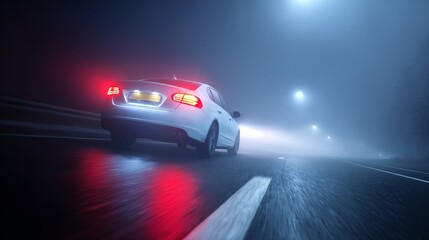 Car driving in fog on highway at night showing low visibility traffic risk, night driving caution, road safety awareness, transportation danger concept and careful travel conditions