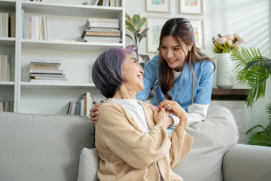 Young asian caregiver or woman nurse hand on senior female shoulder give support empathy to care,consulting and encourage,take a history and recommend the right treatment to live happily in retirement