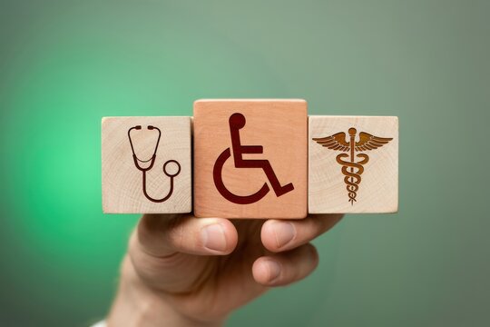 Hand holding wooden blocks with medical and disability symbols against a green background