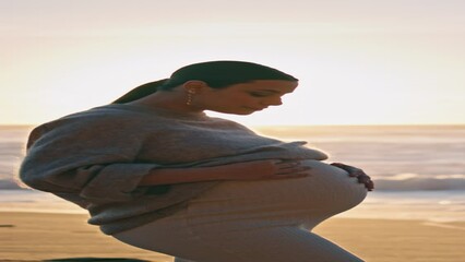 Expectant mother posing sunset beach caressing belly vertical. Pregnant woman