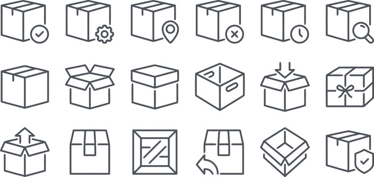 box, icon, line art, delivery, logistics, shipping, handling, package, cargo, parcel, container, symbol, vector, illustration, design, graphic, element, sign, flat, outline, stroke, check mark, gear,