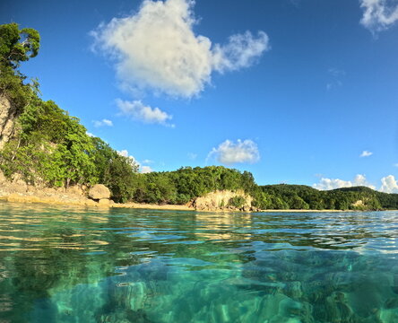 anse canot in evening light seen from the turquoise sea with copy space, caribbean beach in Saint Louis, Marie Galante, Guadeloupe
