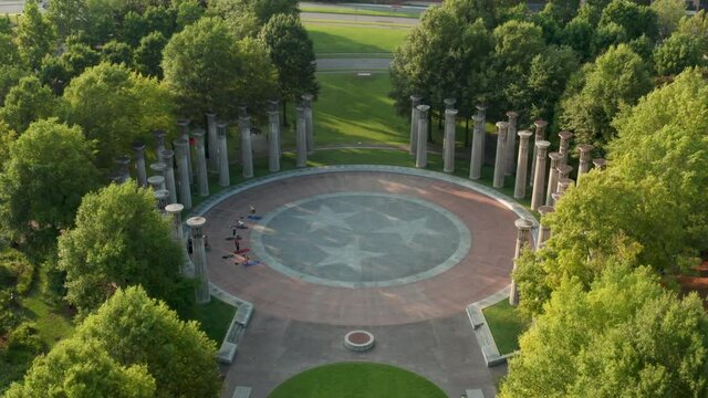 Aerial tilt down reveals carillon pillars and people doing yoga. Tennessee state emblem, logo.