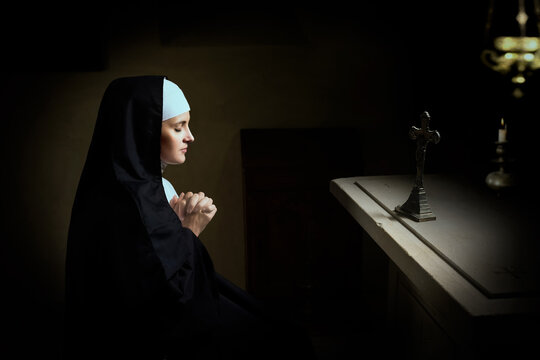 Old woman Nun praying in medieval landscape with mystical cathedral church in distance, watercolor illustration