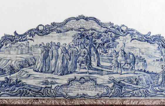 ALCOBACA, PORTUGAL - Azulejos depicting a religious scene in the Mosteiro de Santa Maria