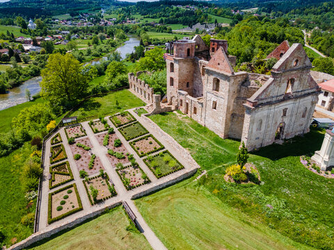 Drone View at Carmelite Monastery  Ruins and Garden in Zagorz, Podkarpackie, Poland.  Summer Day.