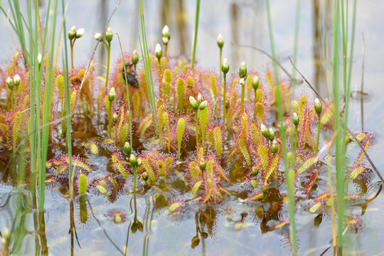 Sundew, beautiful long leaved (Drosera anglica) carnivorous plant with white flowers found in bog, Alaska, United States
