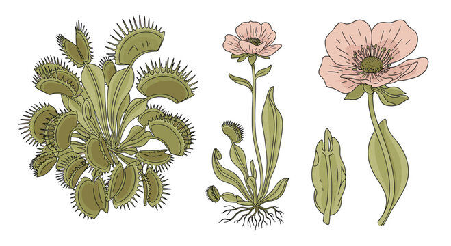 Botanical illustration of various carnivorous plants including a venus flytrap and delicate flowering species