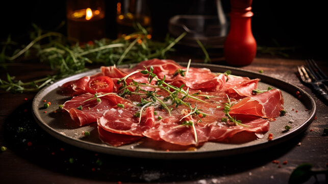 delicious Italian appetizer beef carpaccio . modern food photography in rustic style . in detail
